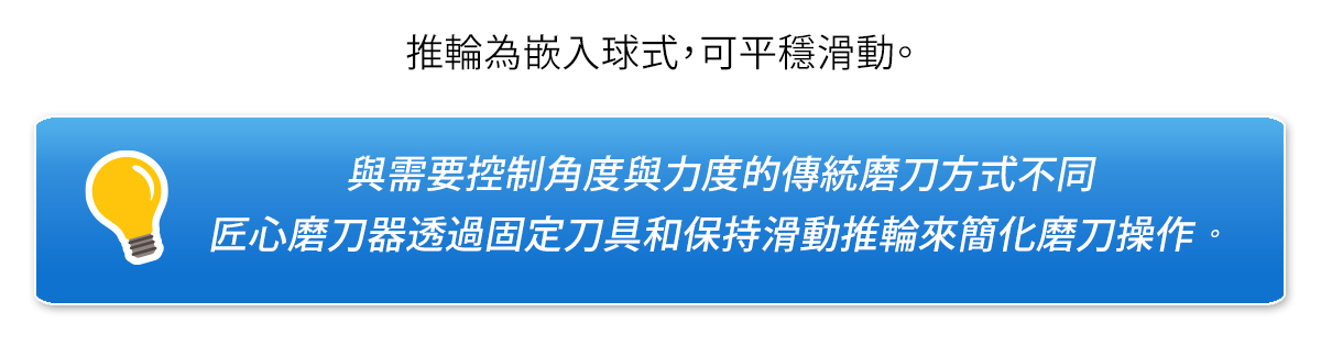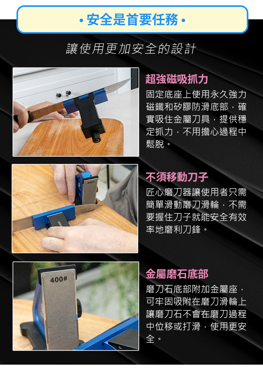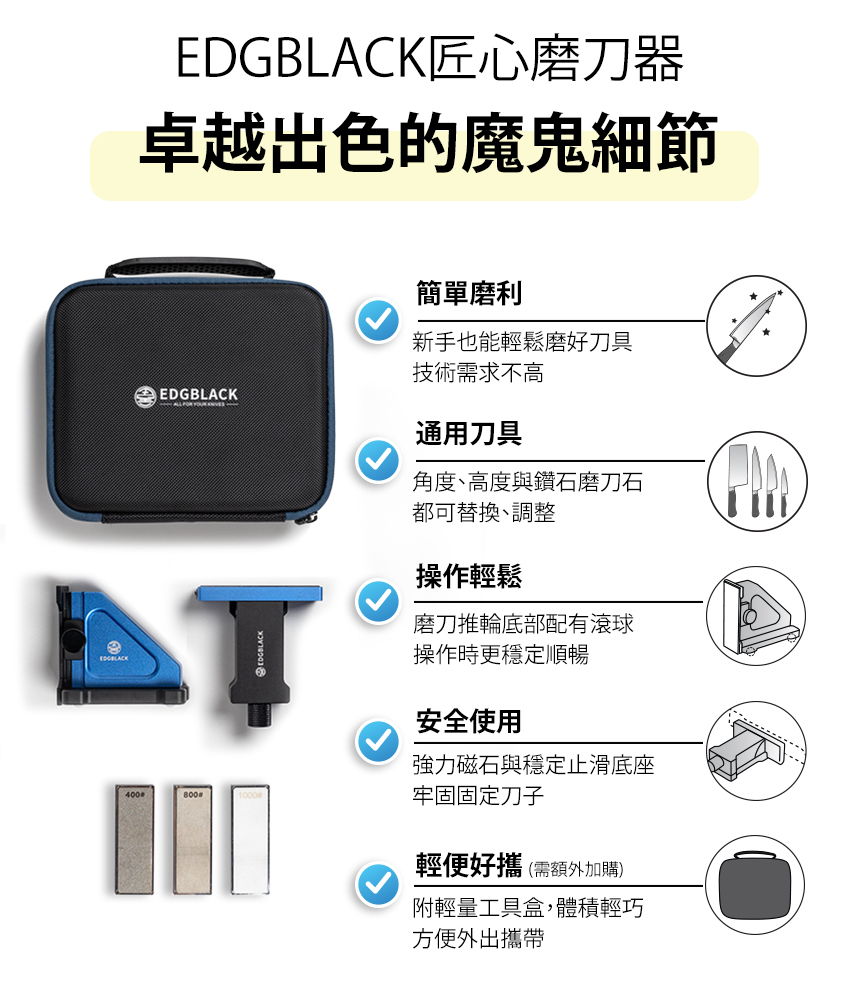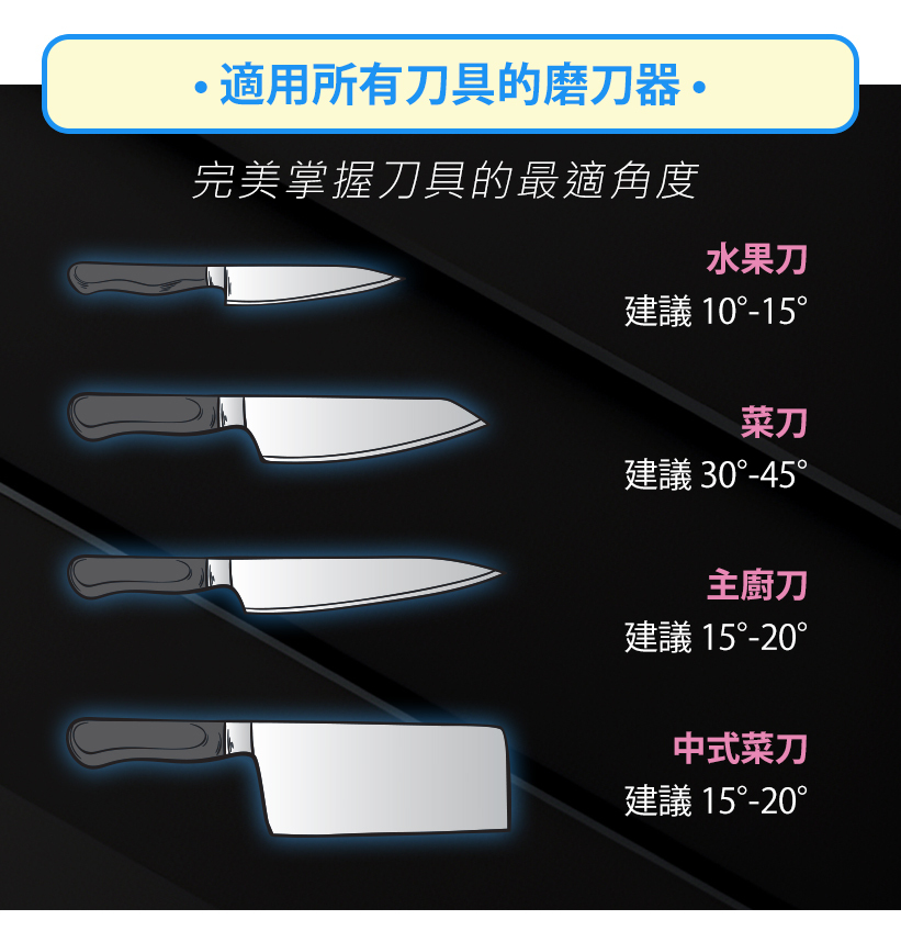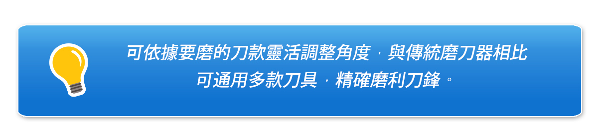 快速恢復鋒利刀刃,容易操作,可調設計與穩定防滑底座提供專業級精準操作,適用多種廚刀款式,小巧又便攜,不論在家或外出使用都方便。從此,可以更安全的把廚刀磨得更鋒利!