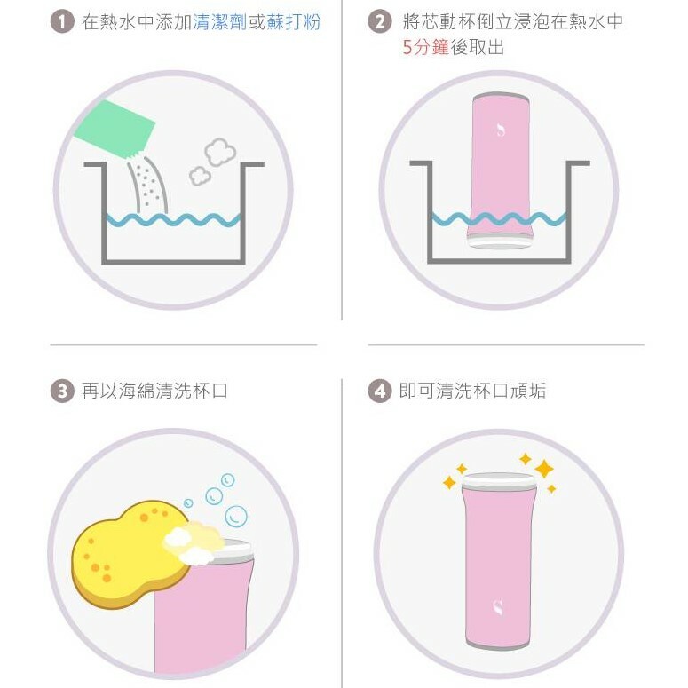 4. 如欲難纏的污漬,可以放入少許的醋、小蘇打或檸檬酸,並靜置約6-12小時,即可以清除。