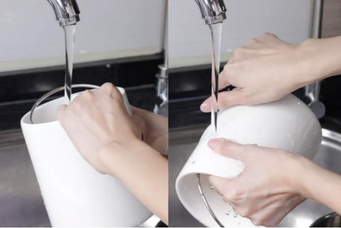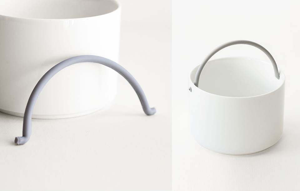 每個陶瓷碗都配有方便取出的手提把,為了不讓食物溢出把手側邊的小洞,請確保將食物或湯品盛裝在手柄之下。
