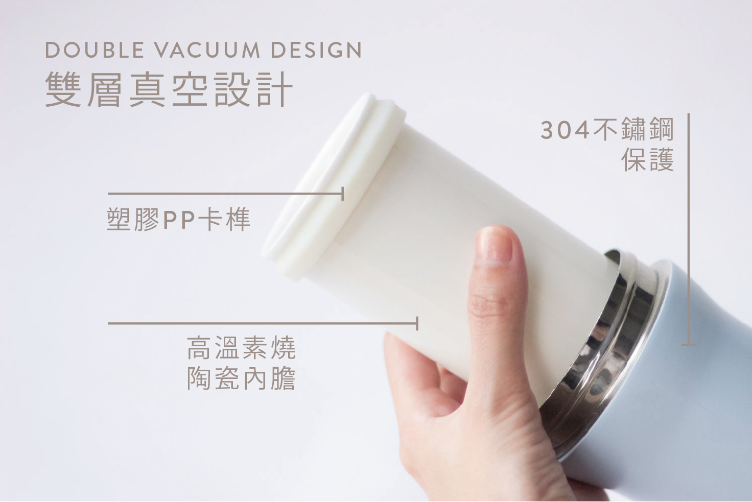 材質:杯身 304 不鏽鋼 / 杯蓋 304 不鏽鋼(SGS 認證)/ 杯蓋 PP、食用級耐熱矽膠 / 內芯 100% 硬白瓷 耐熱:陶瓷內芯 1000°C / 杯蓋矽膠 220°C / PP 杯蓋 120°C