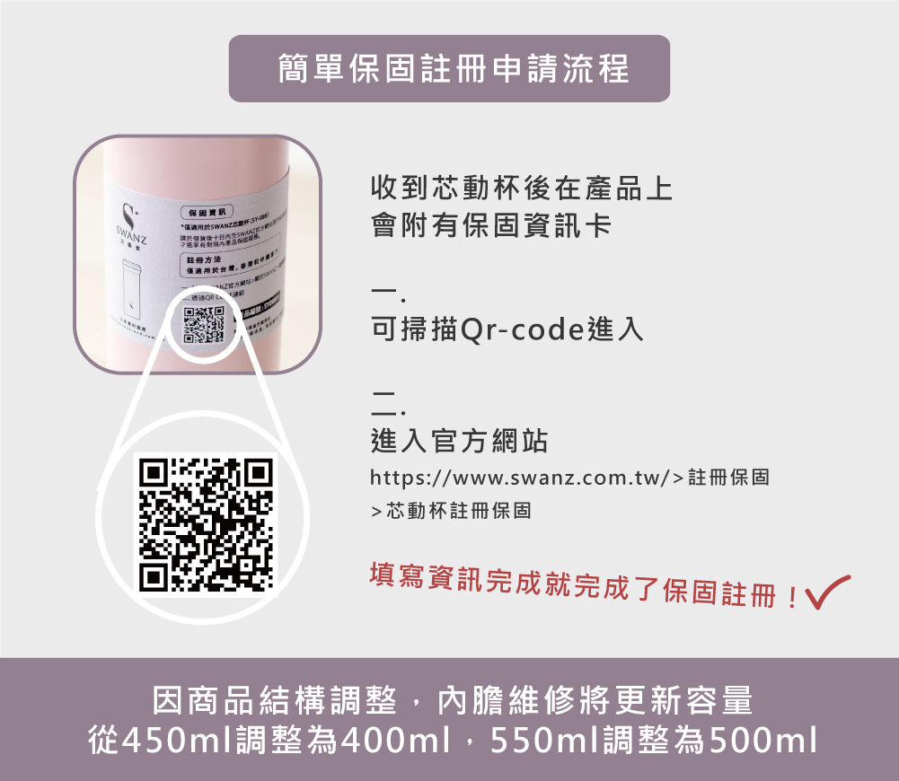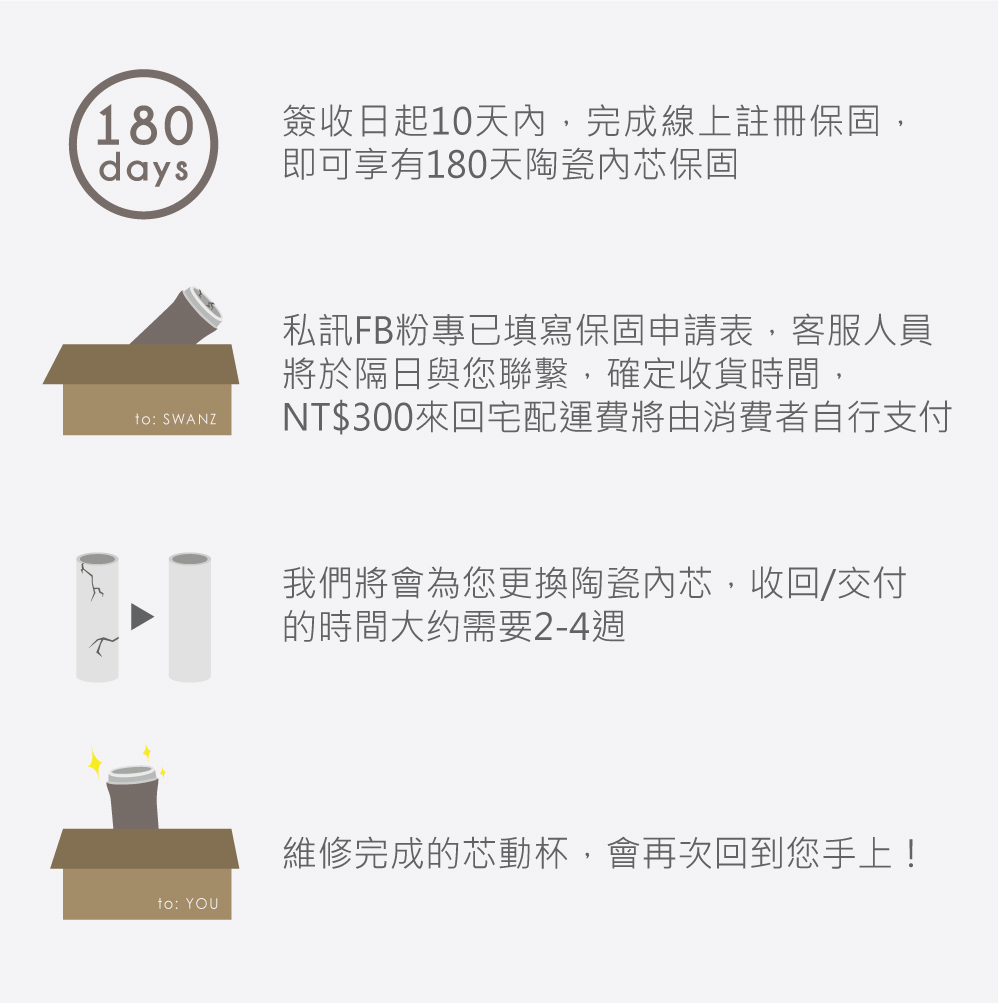 SWANZ 芯動杯不僅對產品有自信,更提供 180 天的內芯保固,只要上網登錄保固資訊,在期限內破了都能免費更換。