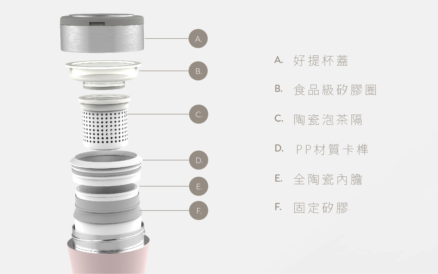 可加購陶瓷茶隔,泡完即喝、不沾手,泡茶不再滴得到處都是!拆卸設計,清洗方便,想使用時再裝上,攜帶無負擔;除了茶包,也能盛裝中藥、茶葉、水果塊,隨時享用喜愛的熱飲。