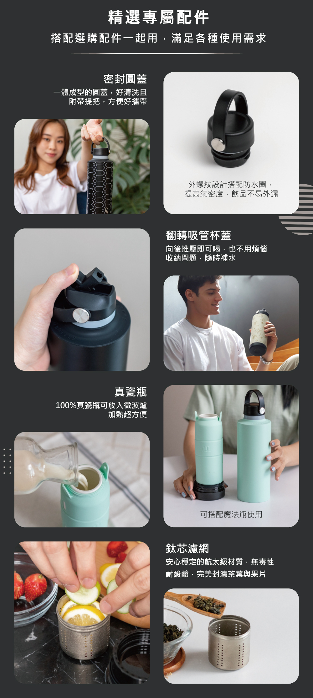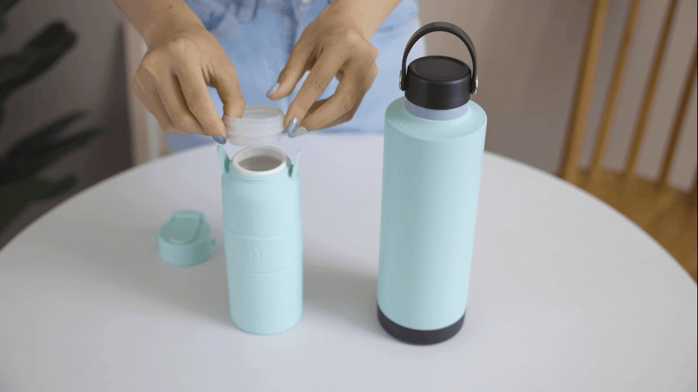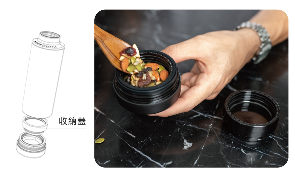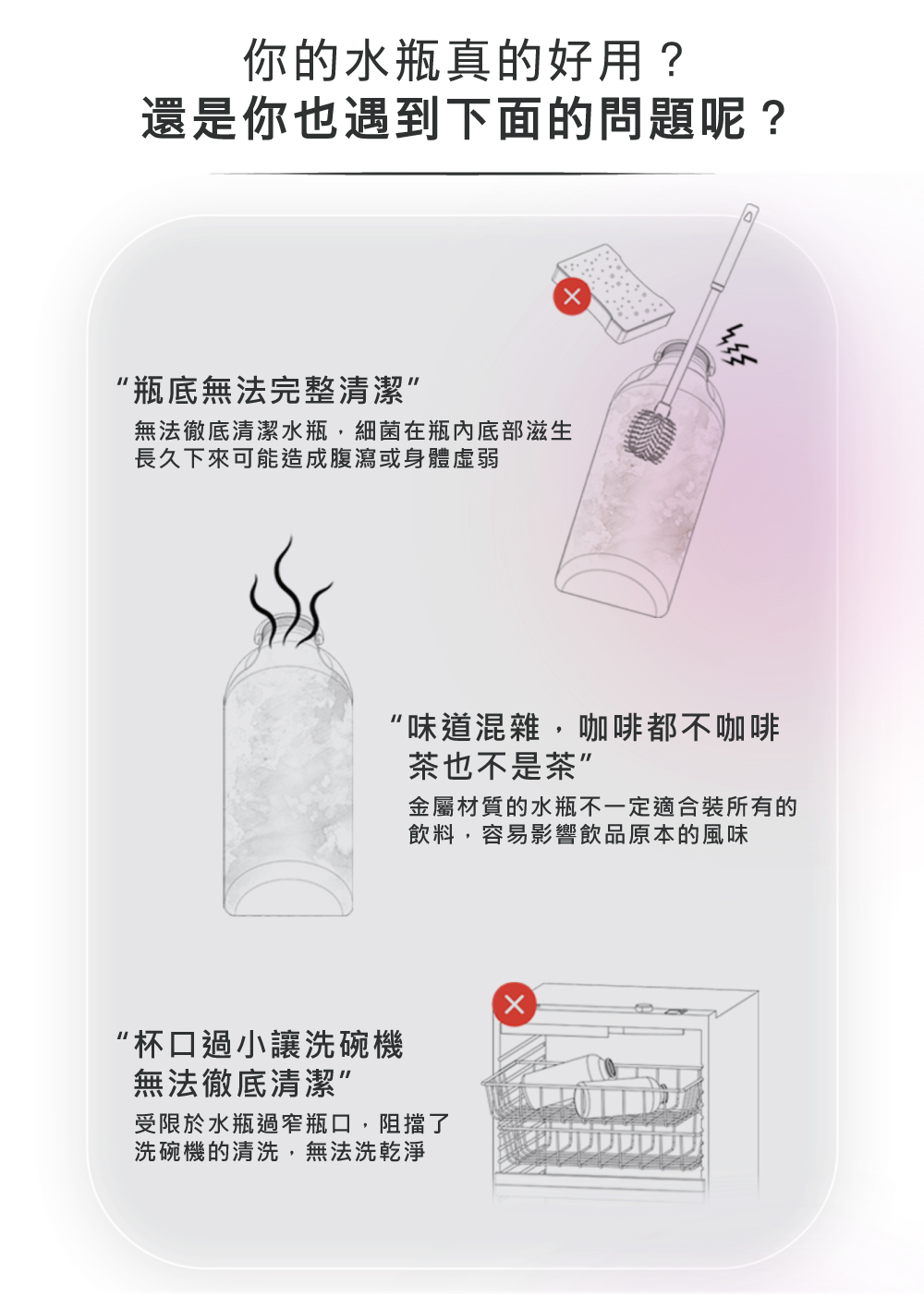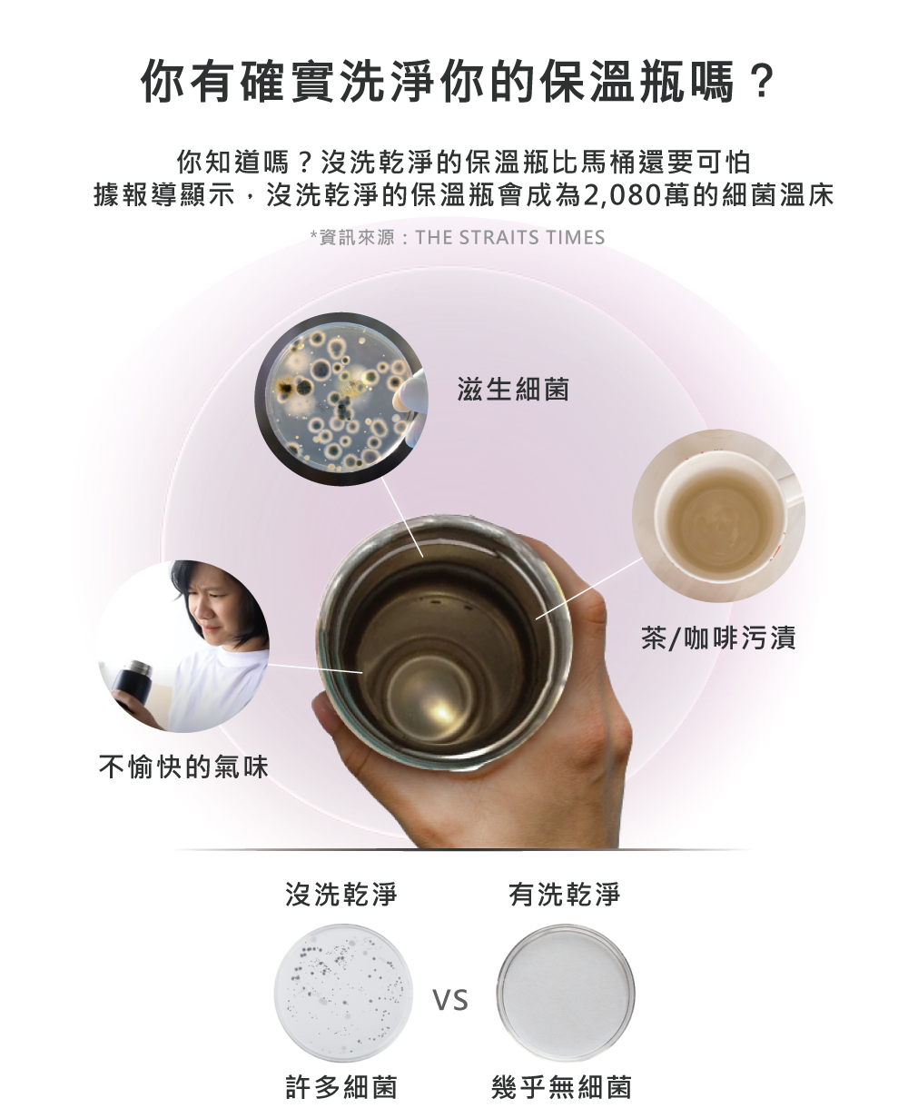 獨特雙開蓋結構,讓最難洗到的瓶內底部也能輕鬆洗淨,不養細菌、不易藏汙納垢,喝得更安心。