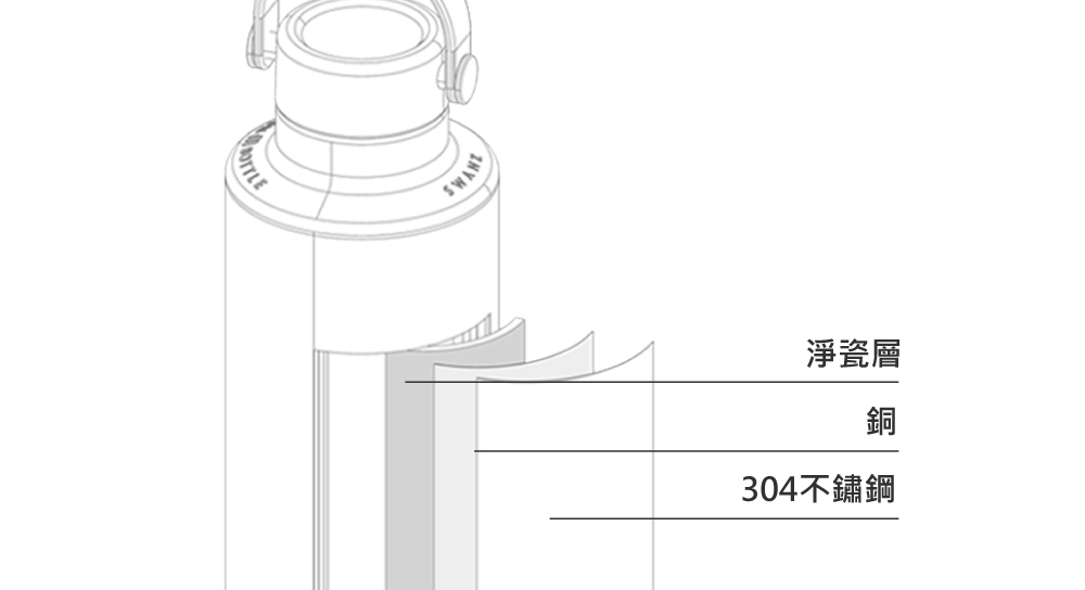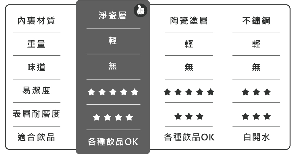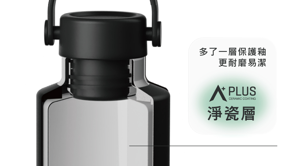 淨瓷塗層內裏搭配堅固的304不鏽鋼瓶身,耐用、易潔又輕盈,味道污漬不易殘留。