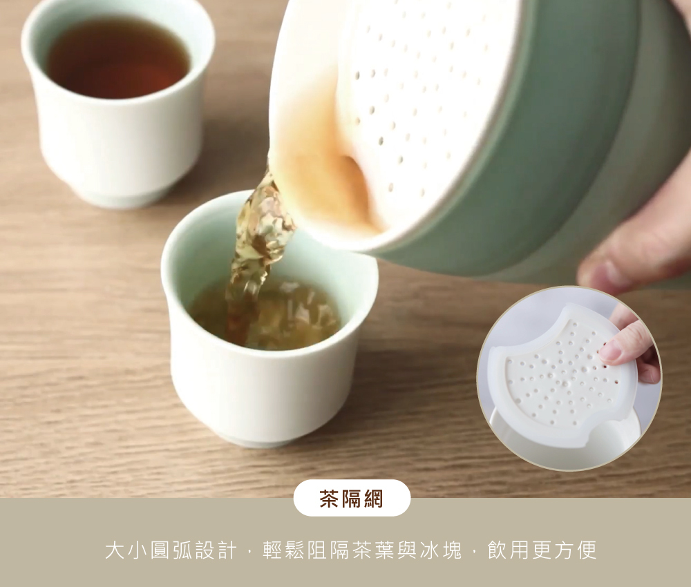 適用 450ml 與 850ml 陶瓷杯,大小圓弧設計,可過濾茶葉或冰塊,方便飲用。