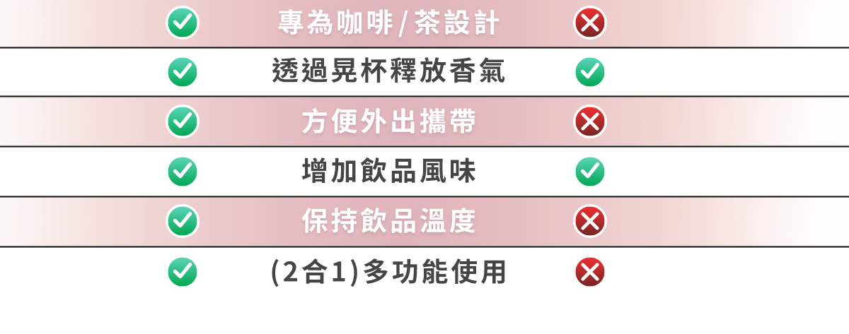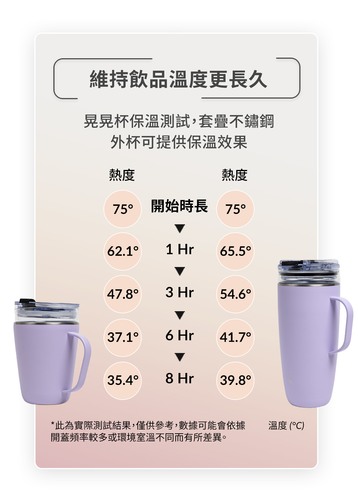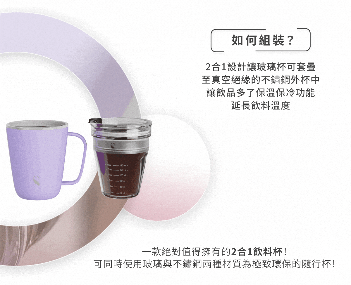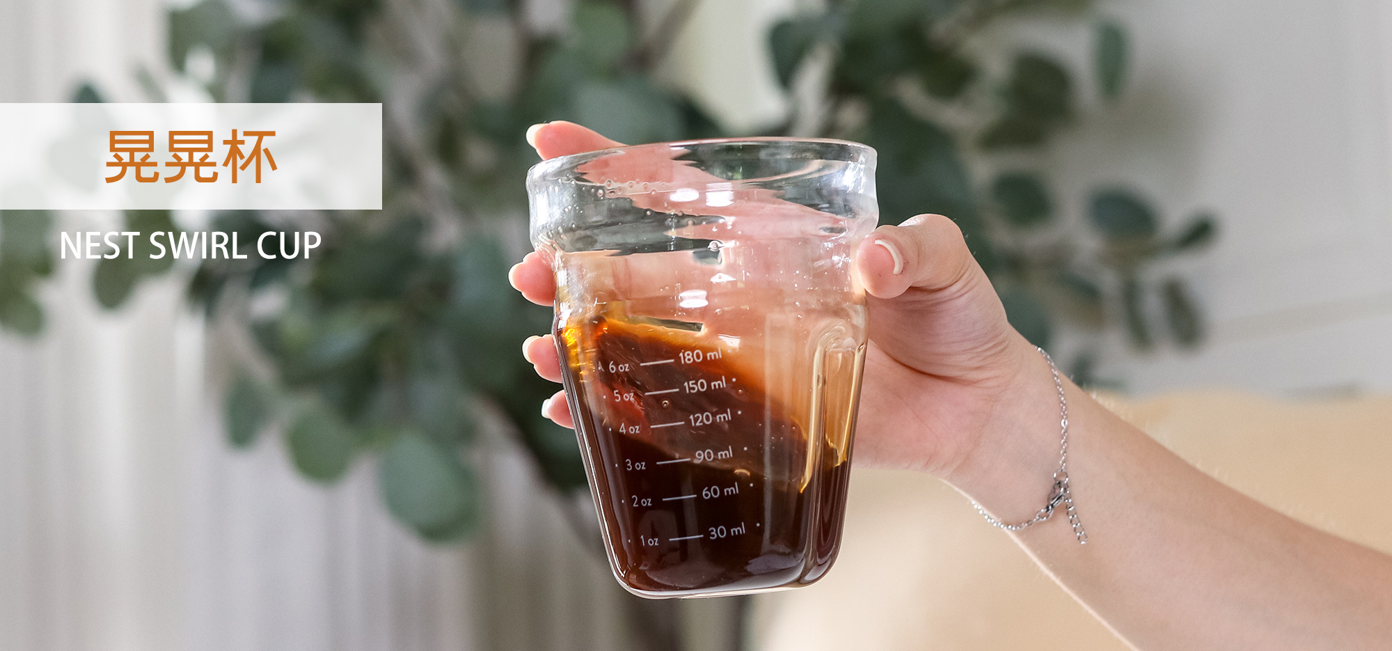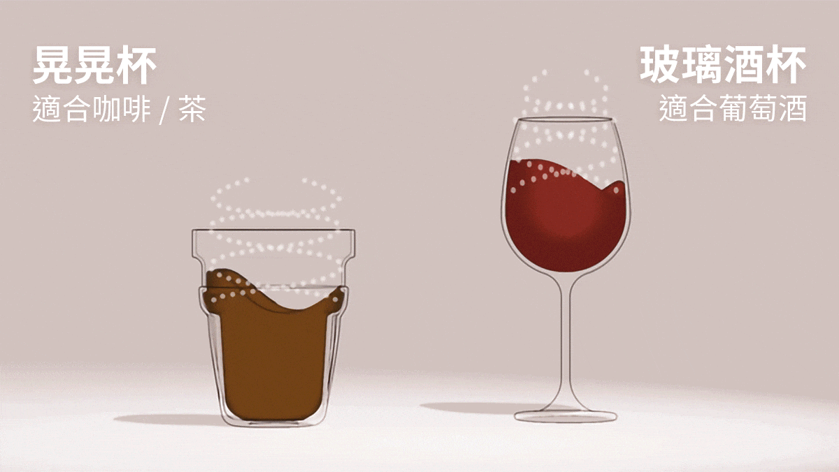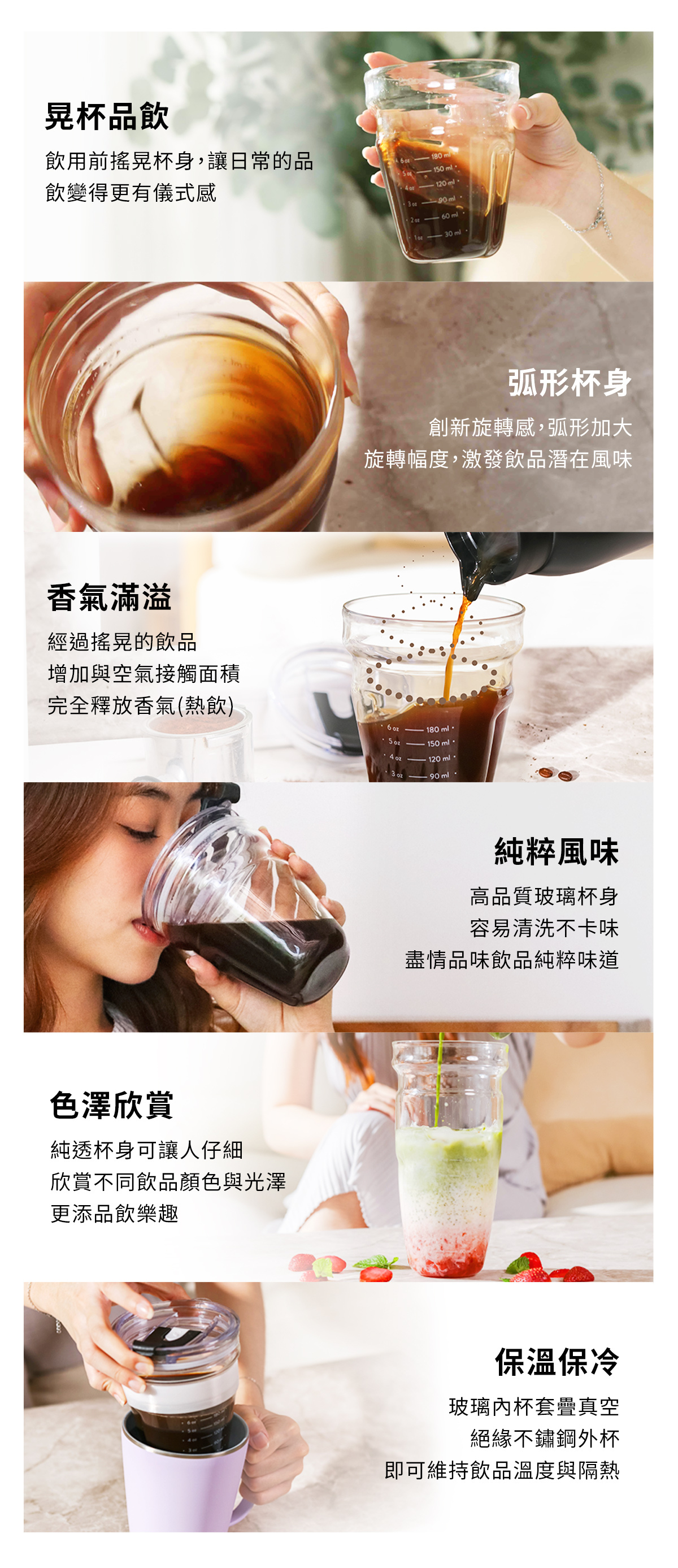 獨特弧形玻璃杯,創新旋轉感,幫助飲品在搖晃過程中釋放香氣,提供更佳的感官體驗,讓咖啡或茶喝起來更香醇;想要延長品飲溫度時間,那就放入真空絕緣的不鏽鋼杯中吧。晃晃杯為日常品飲帶來一種全新的品飲體驗,等您一起來探索。