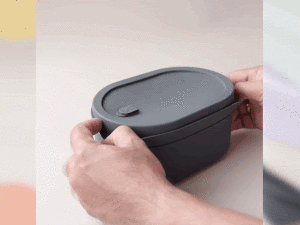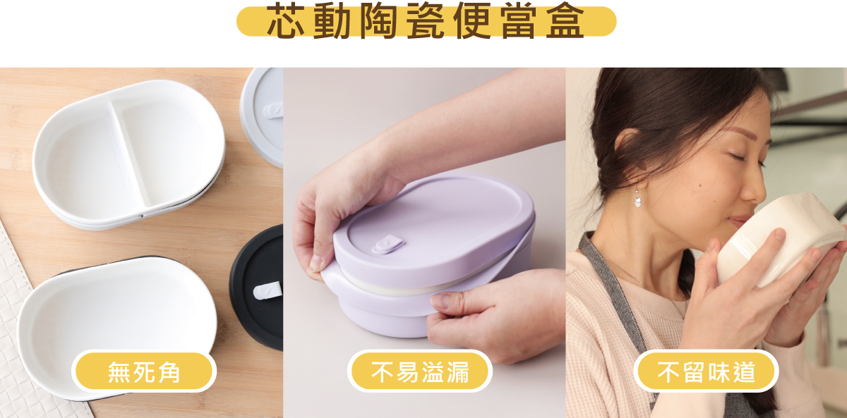 陶瓷內芯外包覆矽膠套,隔熱、止滑、防碰撞又防溢漏;輕鬆開合設計,有別於以往便當盒開蓋方式。
