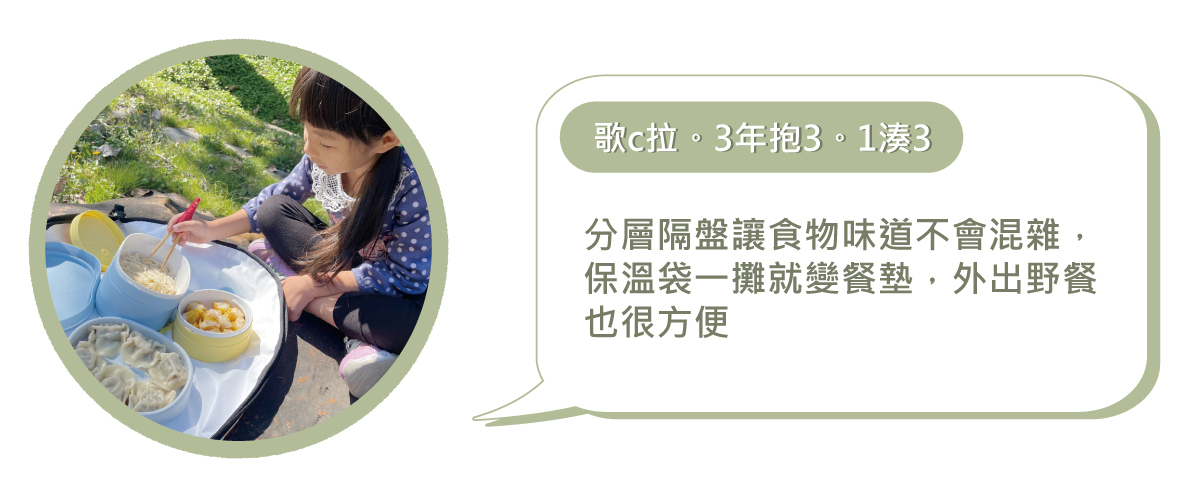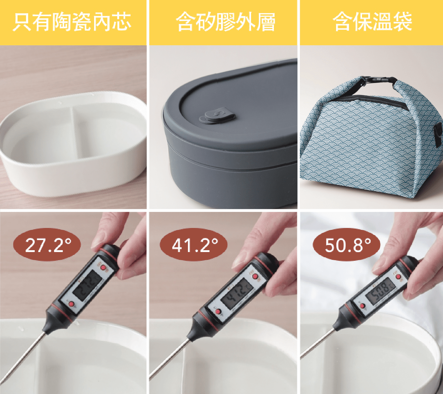 使用三層不同材質組合,2 小時後進行實測,保溫袋強化隔熱效果,保留便當風味,讓每一口都是理想溫度。