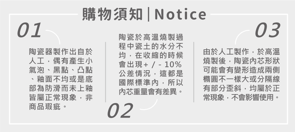 ⚠ 陶瓷於高溫燒製過程中瓷土的水分不均,在收縮的時候會出現+/-10%公差情況,這都是國際標準內,所以內芯重量會有差異。