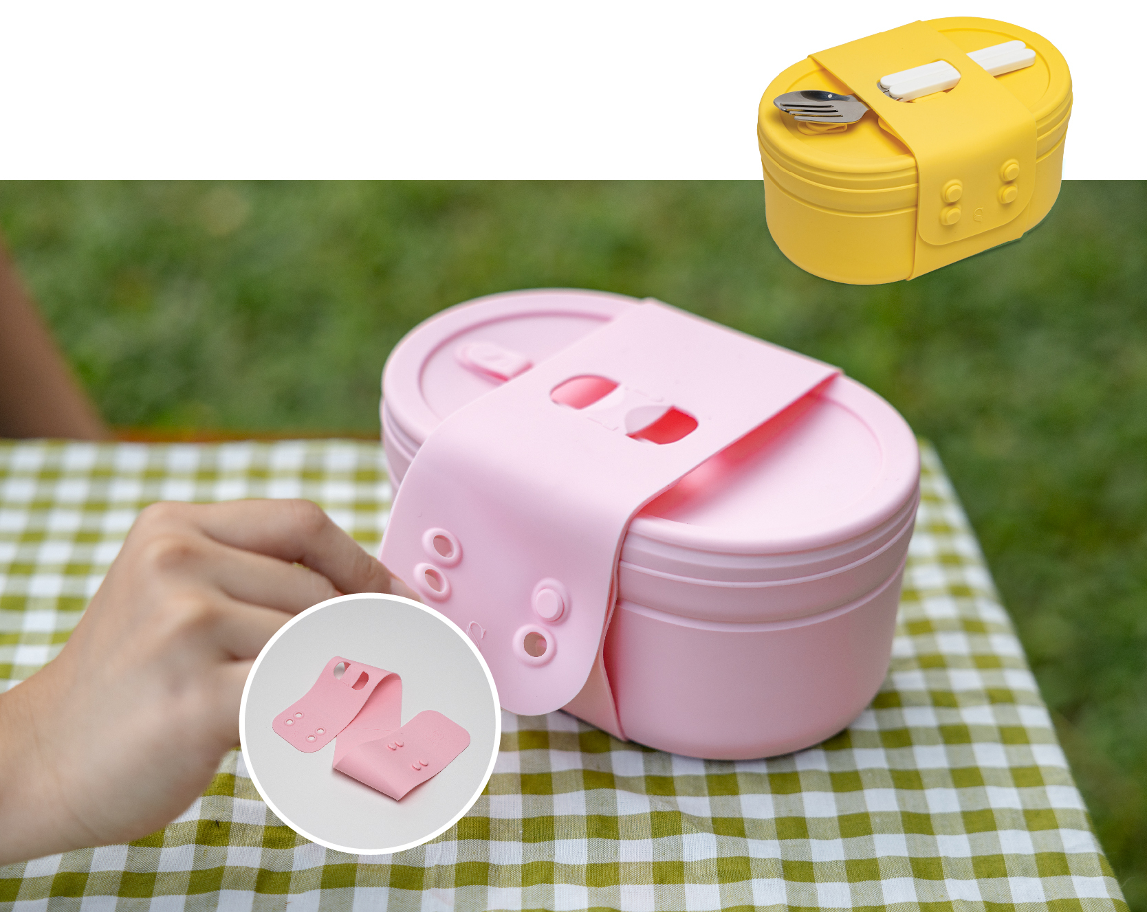 束帶讓便當盒上蓋與內芯更加緊密,不用擔心湯汁外漏。帶子上的小孔還能放餐具,讓攜帶便當變得更安心、方便。