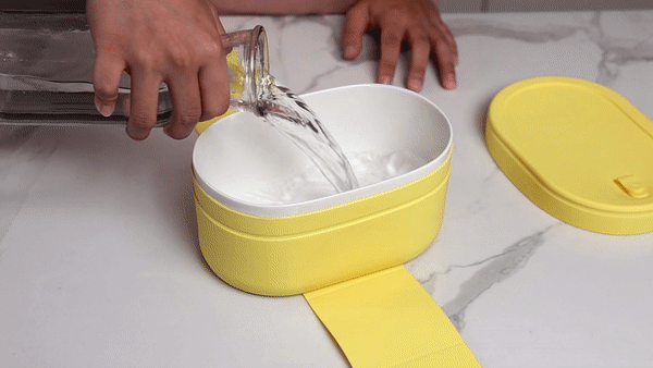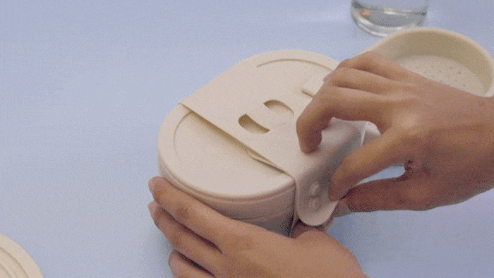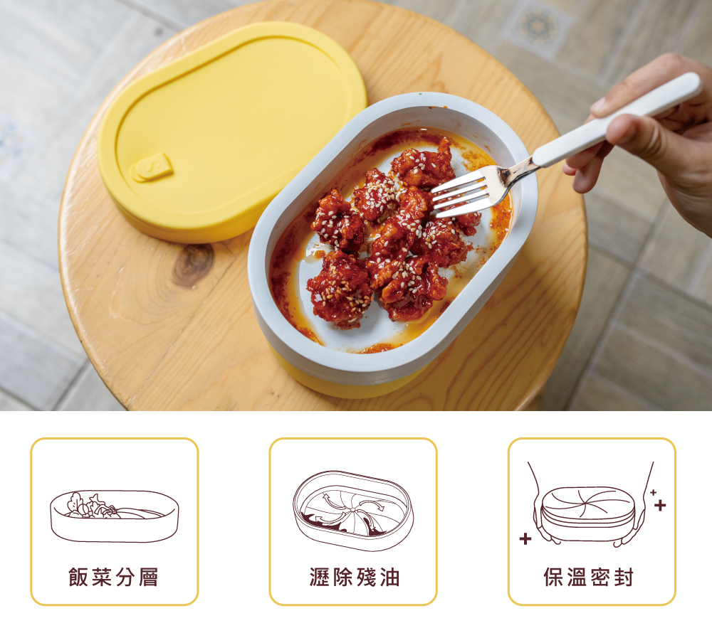 陶瓷內芯外包覆矽膠套搭配束帶,止滑、防輕微碰撞與防溢漏;有別於以往便當盒開蓋方式,更輕鬆省力,沒有扣環斷裂疑慮。