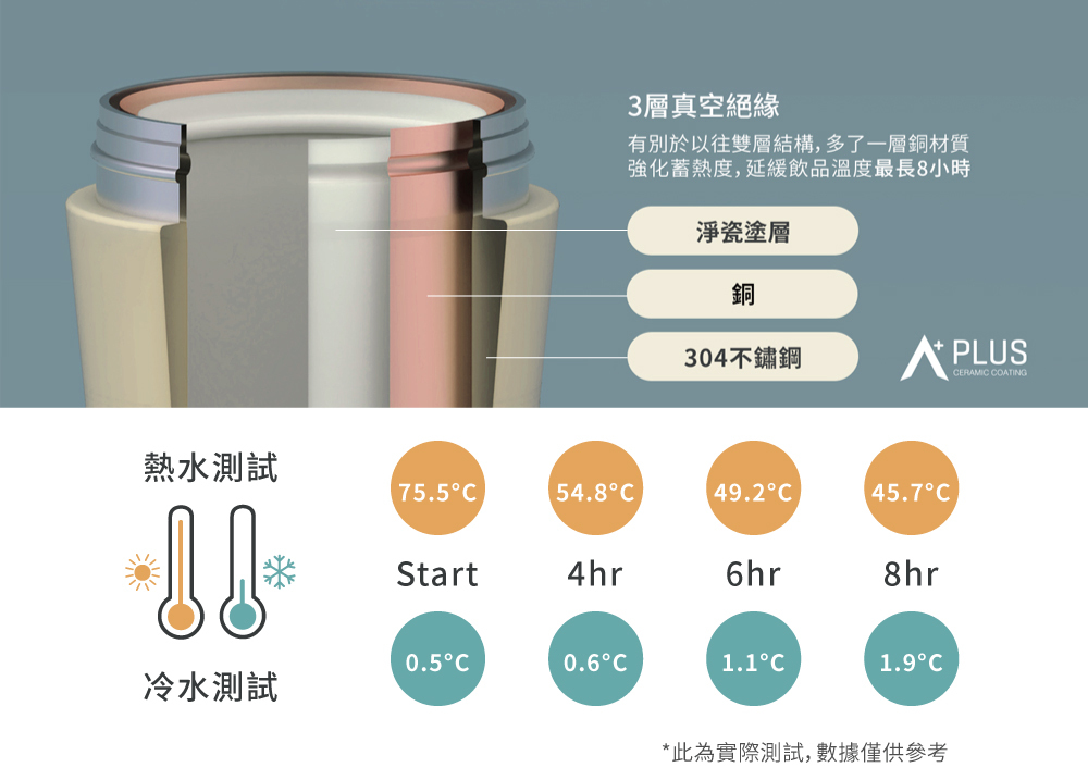 比雙層結構多了一層銅材質,強化蓄熱度,延緩飲品溫度最長8小時。