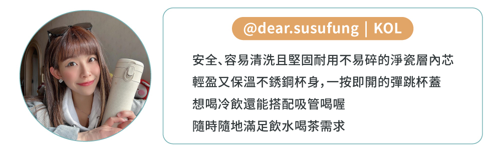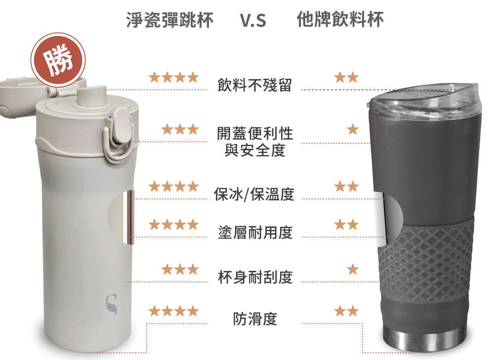 一按即開,秒彈直飲,女生也能輕鬆握拿;組裝式的彈跳吸管,開蓋彈出,蓋上收納,乾淨又衛生;可耐酸鹼的淨瓷層內裏,宛如輕盈的陶瓷,適合盛裝各種飲品,給您品嘗飲品原本風味的最佳芯體驗。