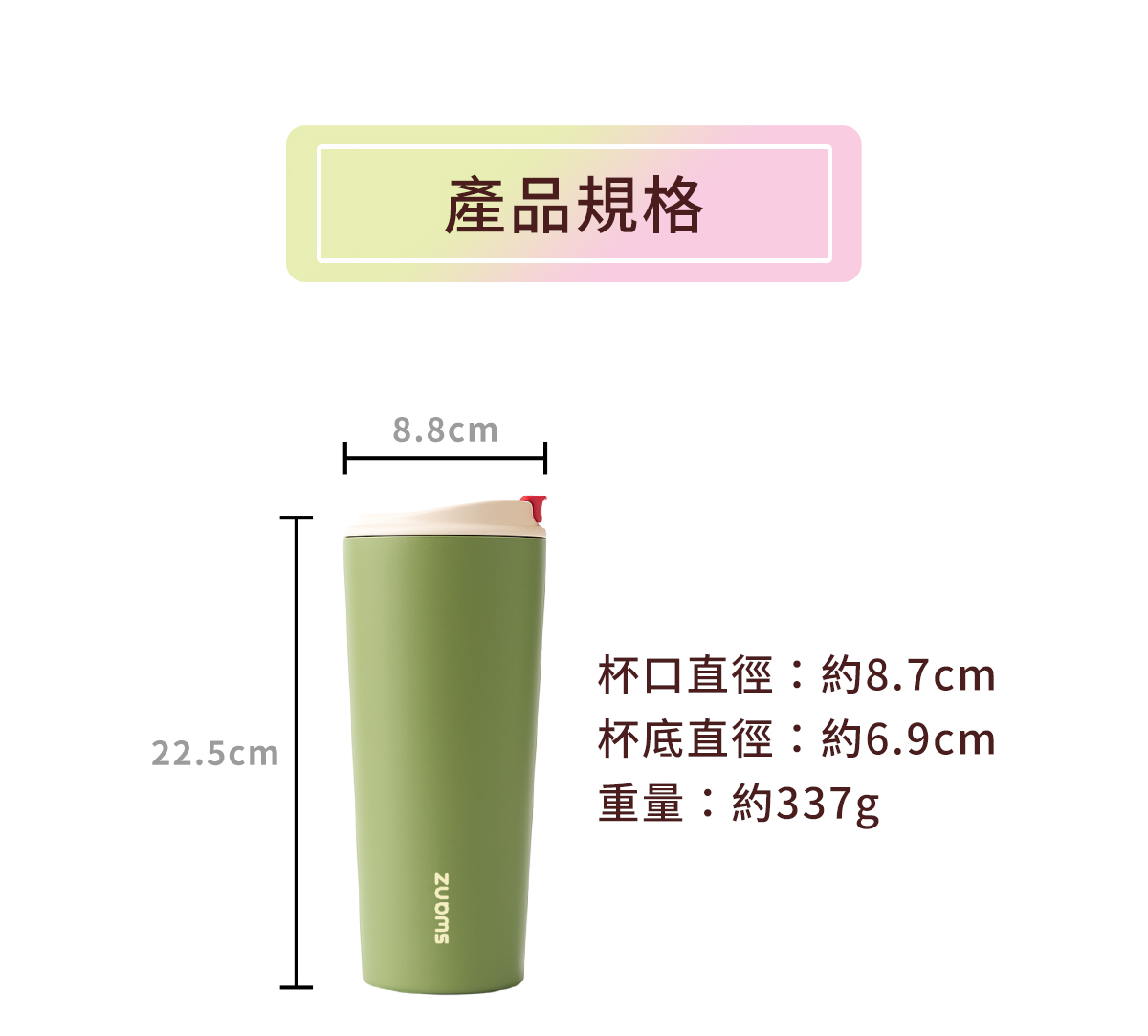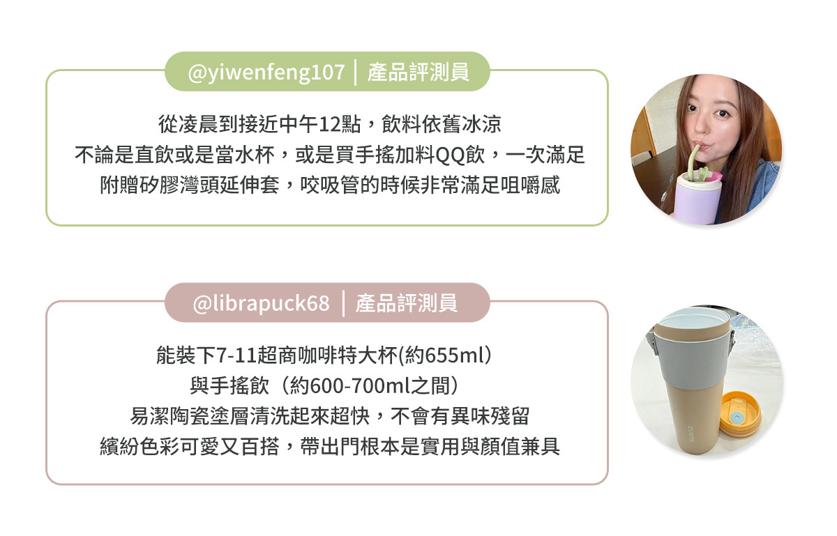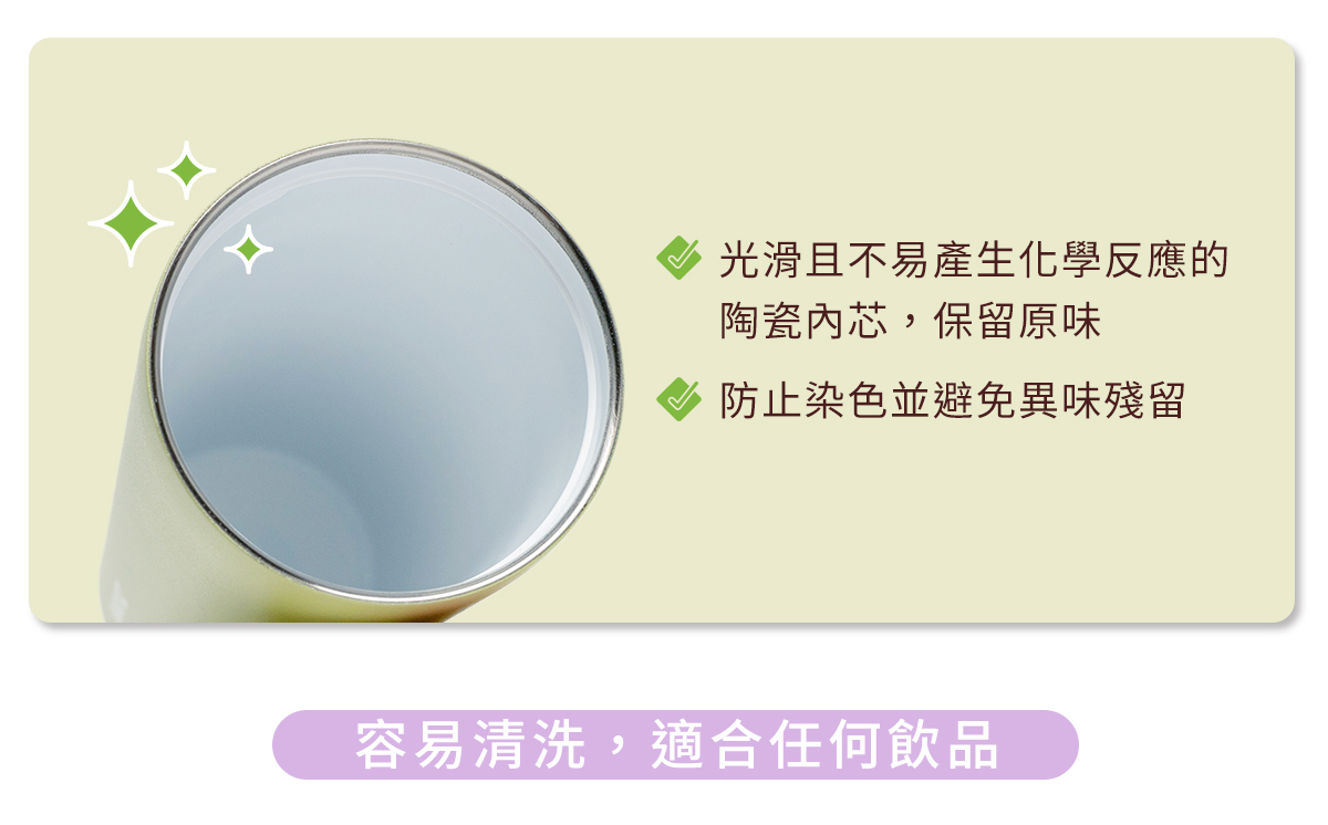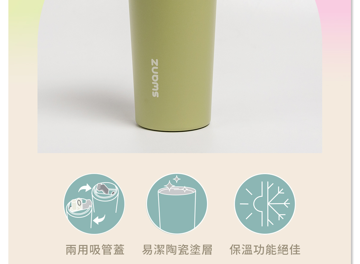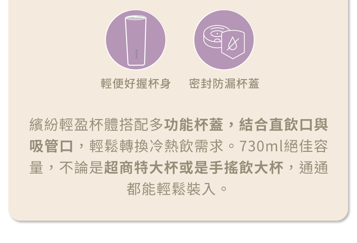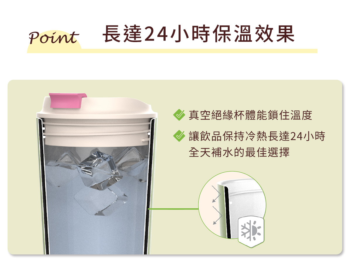 專為外帶飲料設計的隨行杯,730ML充足容量搭配多功能兩用杯蓋,同時有直飲口與吸管口,活潑撞色有質感,時尚百搭。淨瓷內裡搭配真空絕緣的304杯身,容易清洗,輕便好攜帶。最長保溫可達12小時,盡情享受每款飲料