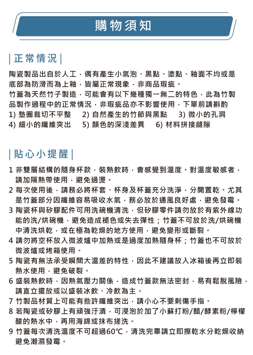 ※ 因陶瓷材質蓄熱度高,如盛裝熱飲時要手拿,請斟酌個人可接受的熱度